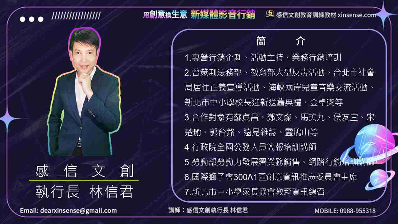 活動策劃主持 社群經營(FB粉絲團、LINE@代運營) 新媒體影片製作 網站架設 業務行銷訓練 資訊課程講座規劃
