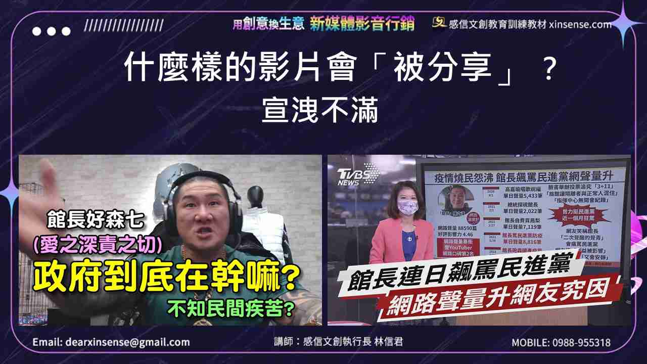人們對於社會上不公不義之事,都有一股怨氣,但大多數人選擇沉默,不想招惹是非。如果有人替你發聲,批判不公不義之事,你就會覺得很爽,心裡那股怨氣終於可以宣洩,你會認同甚至感謝這個替你發聲的人。這樣的影片你就會想幫他分享。