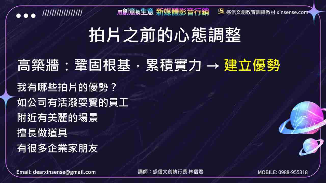影片要有特色,要吸睛,除了內容要對觀眾有幫助,還可以加入其他元素來輔助。所以你要先思考,你有哪些優勢可以為影片加分?