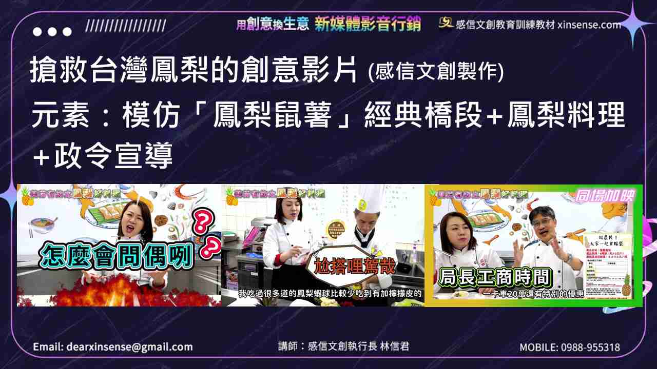 剛好當時鳳梨鼠薯一夕爆紅,我靈機一動,結合模仿鳳梨鼠薯、鳳梨料理教學、政令宣導三種元素,製作一支搶救台灣鳳梨的創意影片,讓觀眾得到娛樂兼學習的滿足感,刺激觀眾的購買慾。