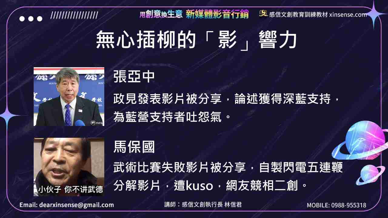 張亞中、馬保國原本都不是網紅,本身也應該不懂網路行銷操作,只是因為他們的影片放在「網路」這個平台,竟引起一連串的效應,改寫他們的人生。